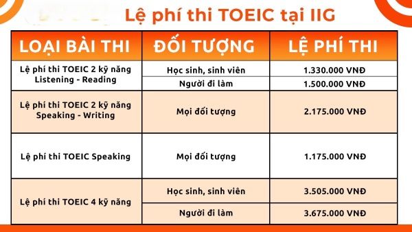 Trên thực tế, lệ phí thi toeic có thể thay đổi tùy theo đơn vị tổ chức, loại hình bài thi và đối tượng dự thi. Thông thường, mức phí cho bài thi hai kỹ năng nghe và đọc sẽ thấp hơn so với bài thi bốn kỹ năng. Sinh viên đang theo học tại các trường đại học thường được hưởng mức phí ưu đãi hơn so với thí sinh tự do.