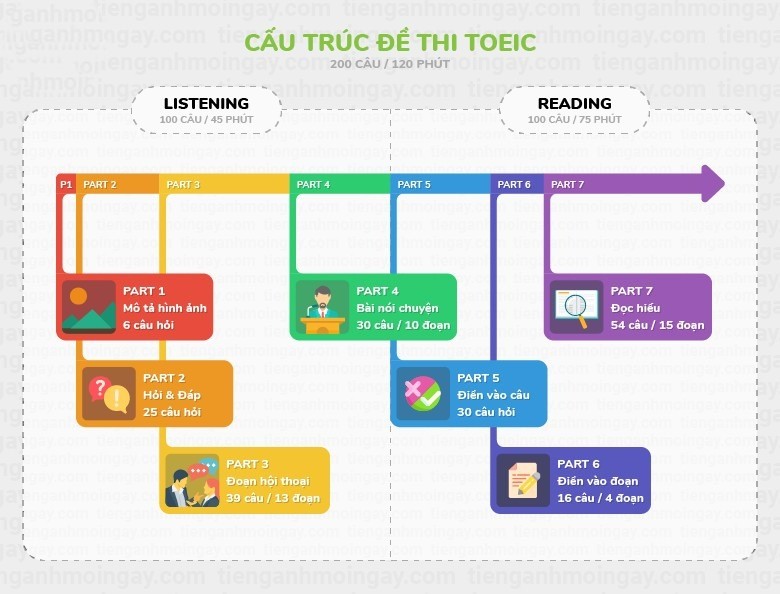 Bài thi được chia thành hai phần với tổng thời gian làm bài khoảng hai tiếng. Phần Listening kiểm tra khả năng nghe hiểu thông qua nhiều dạng câu hỏi như mô tả tranh, hỏi đáp ngắn, hội thoại và bài nói. Nội dung xoay quanh các tình huống quen thuộc trong môi trường làm việc quốc tế.
